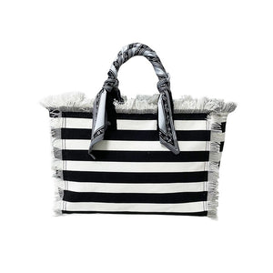 The Sally Striped Tote is one of our favorites because of the scarf details included on the handles. This tote is so versatile and can be dressed up for dinner or carried casually for all of your everyday errands! Impress your girlfriends with this oh so trendy tote! Now all you need to do is decide on which color?
