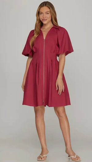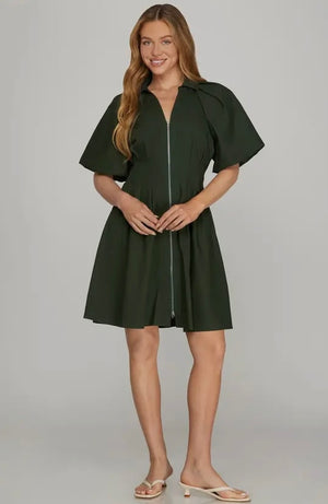 The Zendaya Zipper Dress features a front zipper & a cinched waist that enhances your silhouette with a tailored fit. Its bubble sleeves add a touch of volume, balancing elegance with casual comfort. Perfect for occasions where effortless style meets flattering design.