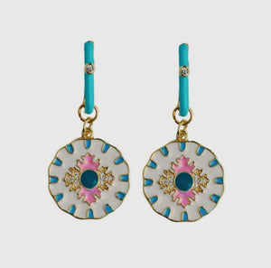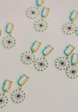 Experience the vibrant charm of Capri with our Capri Charm Earrings. These stunning drop earrings feature a colorful enamel pattern inspired by the island's natural beauty, with a mix of turquoise and pink shades. Make a statement and add a touch of color to any outfit with these unique earrings.