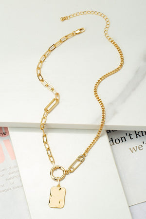 The Olivia Gold Chain Necklace is a keepsake that you'll cherish forever. We're loving its unique style featuring an asymmetrical design of an oval link and curb chain combination, as well as special details such as the paper clip and hammered tag pendant.