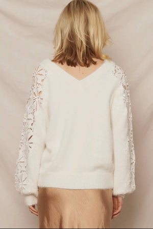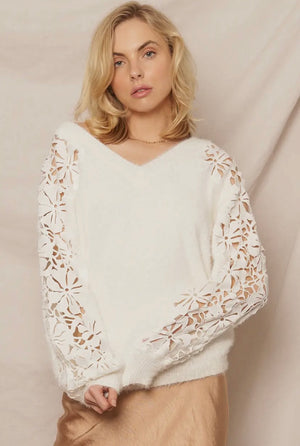 Elevate your wardrobe with our Fuzzy Floral Laced Sleeve Sweater. Made from soft fuzzy fabric, this chic sweater features a unique floral cutout design and a flattering v-neckline. Perfect for transitioning into spring, it will add a touch of sophistication and style to any outfit.