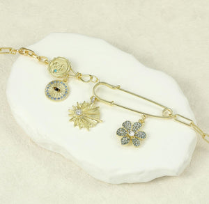 Elevate your style with our Poppy Gold Charm Necklace. Featuring a delicate flower charm, paperclip chain, and an evil eye and North Star charm, this unique statement piece exudes positive energy. The perfect addition to any outfit, this necklace will bring a touch of elegance and positivity to your day.