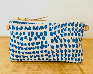 The Bella Blue Dot Wristlet is a stylish and versatile everyday carryall made from durable canvas material. Its cute and fun blue dot design adds a playful touch to any outfit, making it the perfect on-the-go accessory. Elevate your style with this must-have wristlet!