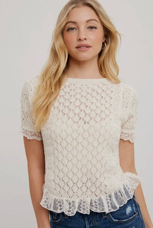 Introducing the Collette Crochet Knit Top, a must-have for your wardrobe! Featuring intricate crochet and lace detailing, this elegant top adds a touch of femininity to any outfit. The unique ruffle trim adds a fancy touch, making it the perfect choice for any occasion. Elevate your style with this stunning piece.