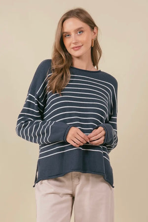 Expertly crafted for comfort and style, our Scarlet Striped Sweater is a must-have for your wardrobe. Featuring a relaxed fit, scoop neck, and side slits for enhanced movement, this sweater is perfect for everyday wear. The classic stripe design adds a touch of femininity to complete the look.