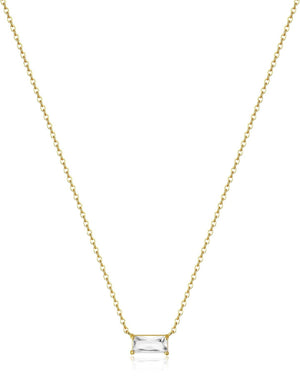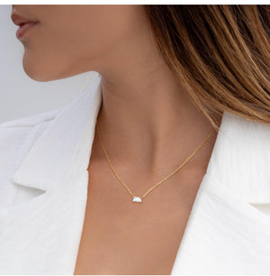 Make a statement with the delicate and dainty Ellie Emerald Cut Pendant Necklace. The clear glass stone and elegant emerald cut make this piece a stunning addition to any outfit. Featuring a dainty gold chain, this necklace is perfect for layering or as a standalone piece.